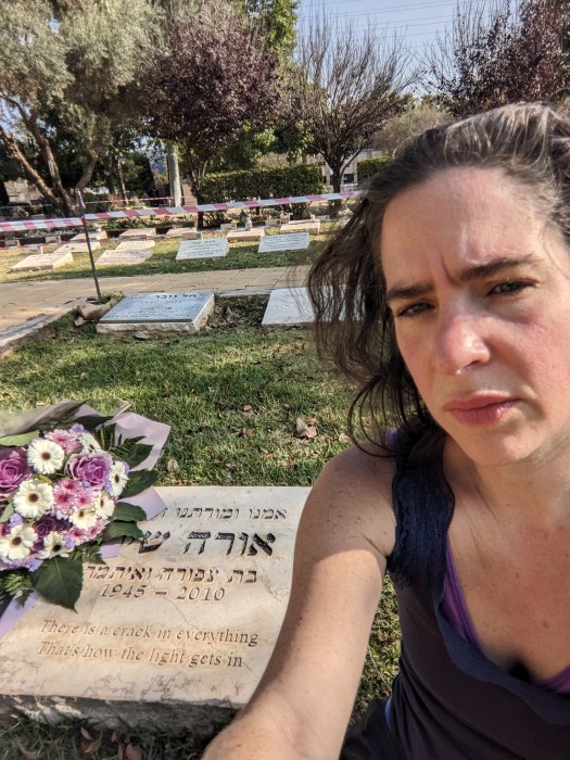 It started yesterday, as I was waiting for the bus to the hospital, after spending the morning touring the hospice. That was a day after I went to my mother’s grave on my own, for her 13th yahrzeit, and also scouted plots for my father. I took videos for him. That was a day after I woke up at 3am sobbing uncontrollably, sobbing like I was throwing up, my face doing a thing I did not ask it to. Once, when Ella was two and had suddenly thrown up, she looked up at me and said: why did I do that? It was like that. My face couldn’t stop for a few hours, and I watched it, curiously, from the inside. Eventually it stopped and I slept a little. But that was when I realized I had to let my face do what it wanted to during the day, so I could get some sleep.